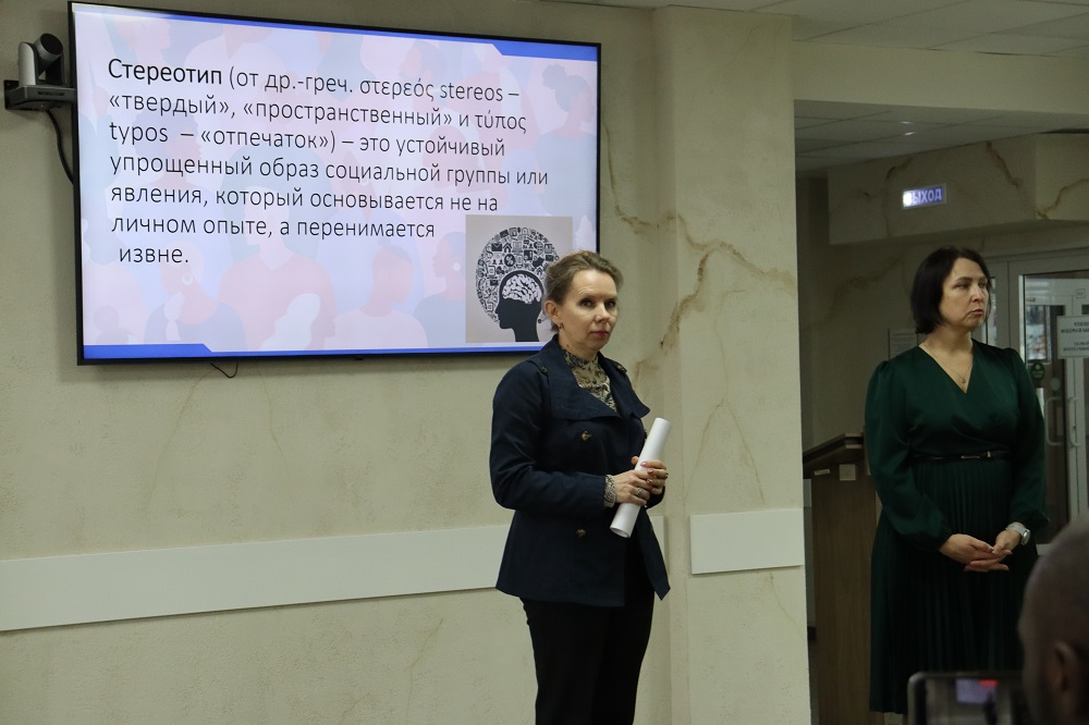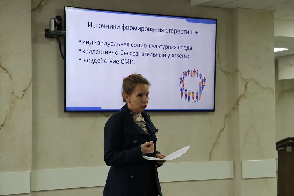Ольга Валентиновна настроила студентов на разговор, отметив, что стереотипы присутствуют в межличностном общении и играют одну из ведущих ролей при формировании образа собеседника.