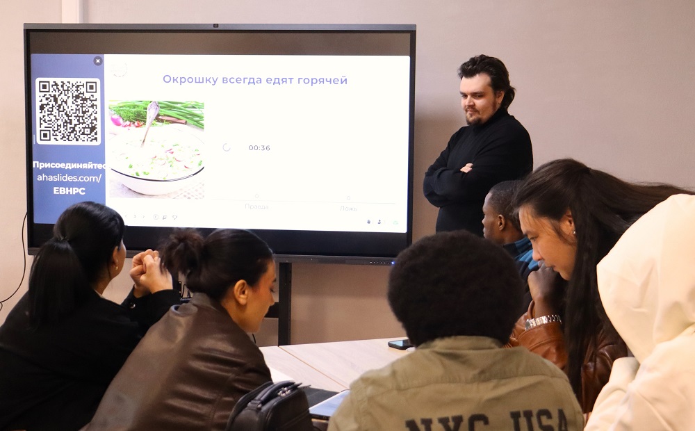 По ходу мероприятия, ведущие, сотрудники отдела литературы на иностранных языках БГУНБ Дарья Коваленко и Иван Говорищев, рассказывали игрокам интересные факты о происхождении таких знаковых блюд, как салаты «Оливье» и «Селёдка под шубой», окрошка, квас, кулич и пасха. Затем участникам мероприятия нужно было стать виртуальными поварами и приготовить онлайн-обед. Иностранные студенты, следуя пошаговым инструкциям ведущего, погрузились в тонкости процесса приготовления тех самых блюд, на вопросы о которых они отвечали.
